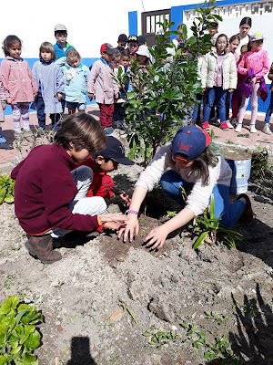 com as professoras e a D. Natércia, a auxiliar. Plantámos medronheiros em